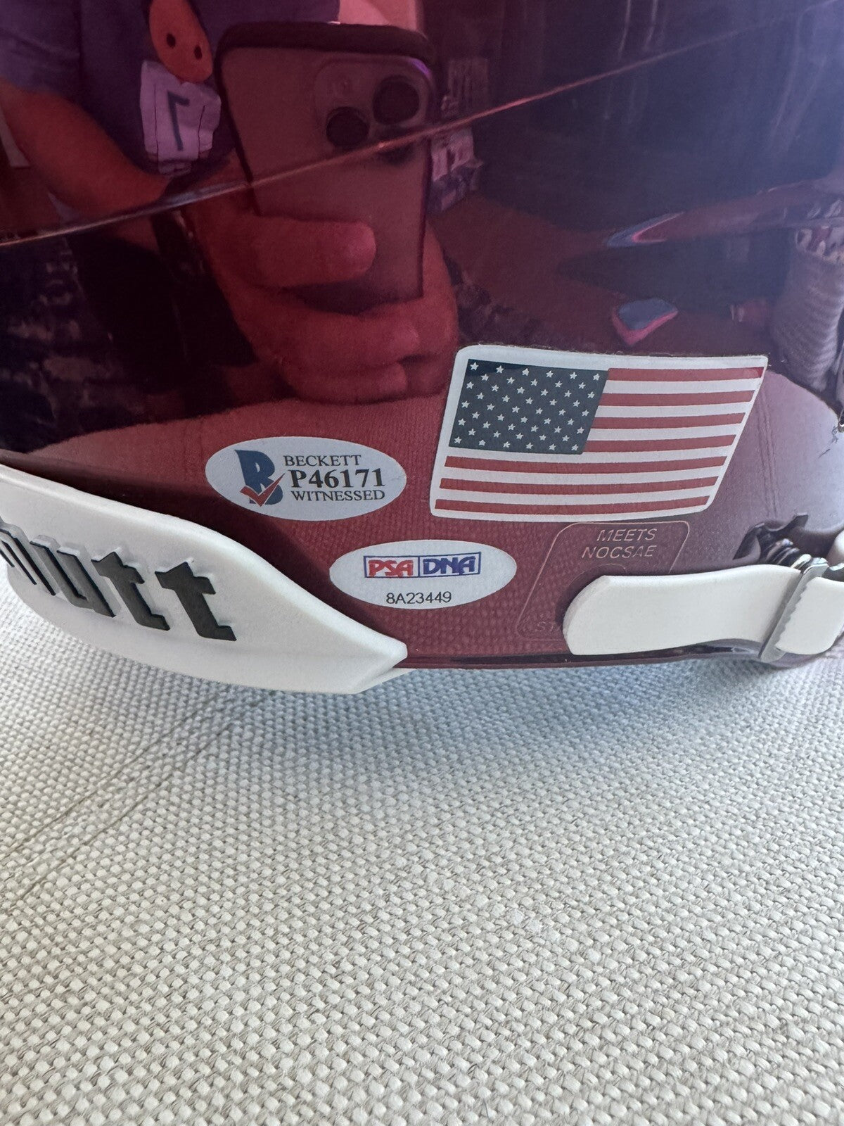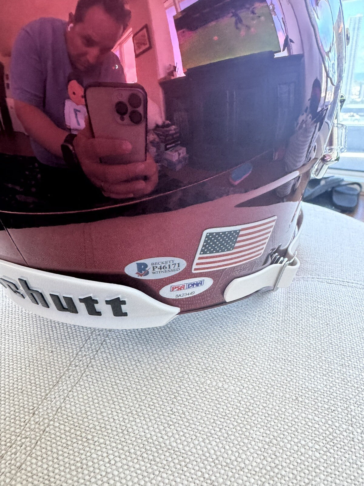 This is a rare and stunning collectible for any USC Trojans fan! A full-size authentic Schutt USC Trojans chrome helmet signed and inscribed by legendary wide receivers Robert Woods and Marqise Lee, showcasing their incredible careers at USC. Both players have detailed their stats and accolades, making this a truly one-of-a-kind piece of college football memorabilia.